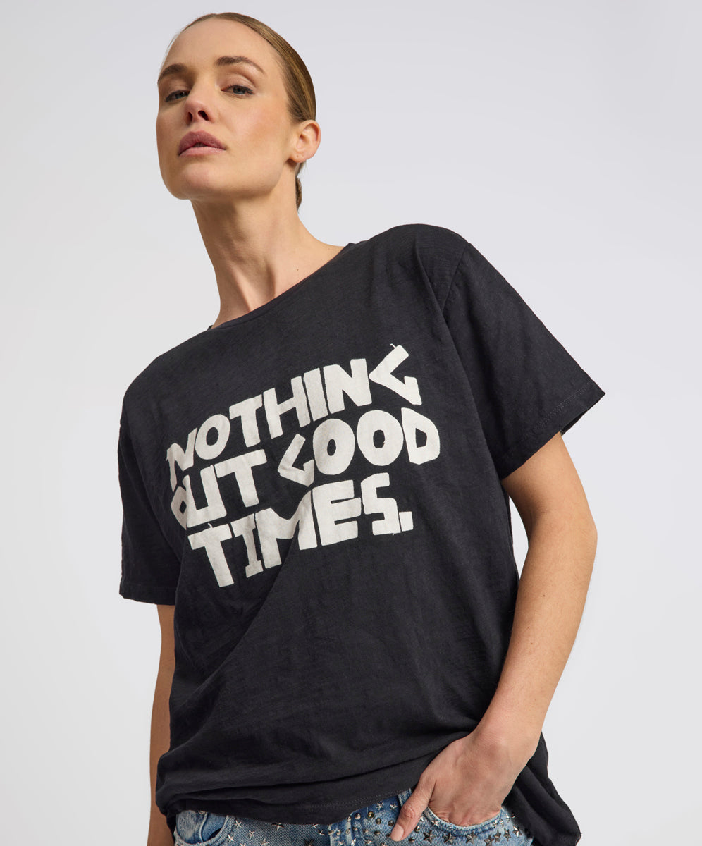 "It’s the slogan that defines us — raw, real, and unapologetically optimistic. ‘Nothing But Good Times’ has become a mantra over the years. We wanted this tee to feel like something you’ve had forever — that perfect vintage softness and bold print that makes it feel instantly cool."
