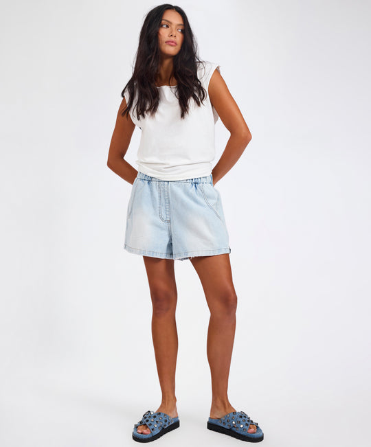 The BLUE LATTE FUNKS HIGH WAIST ELASTICATED FLIPPY DENIM SHORTS bring retro energy and all-day comfort. Relaxed, playful, and effortlessly cool — they’re made for those who live in denim.