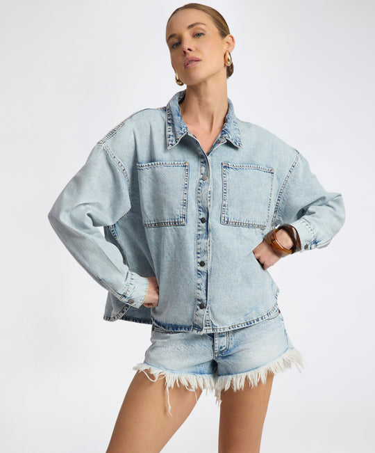 The WHISPER BLUE JE T’AIME DENIM SHACKET is a statement layer designed to wear your heart on your sleeve—literally. A classic denim shirt silhouette with a playful, love-driven twist.