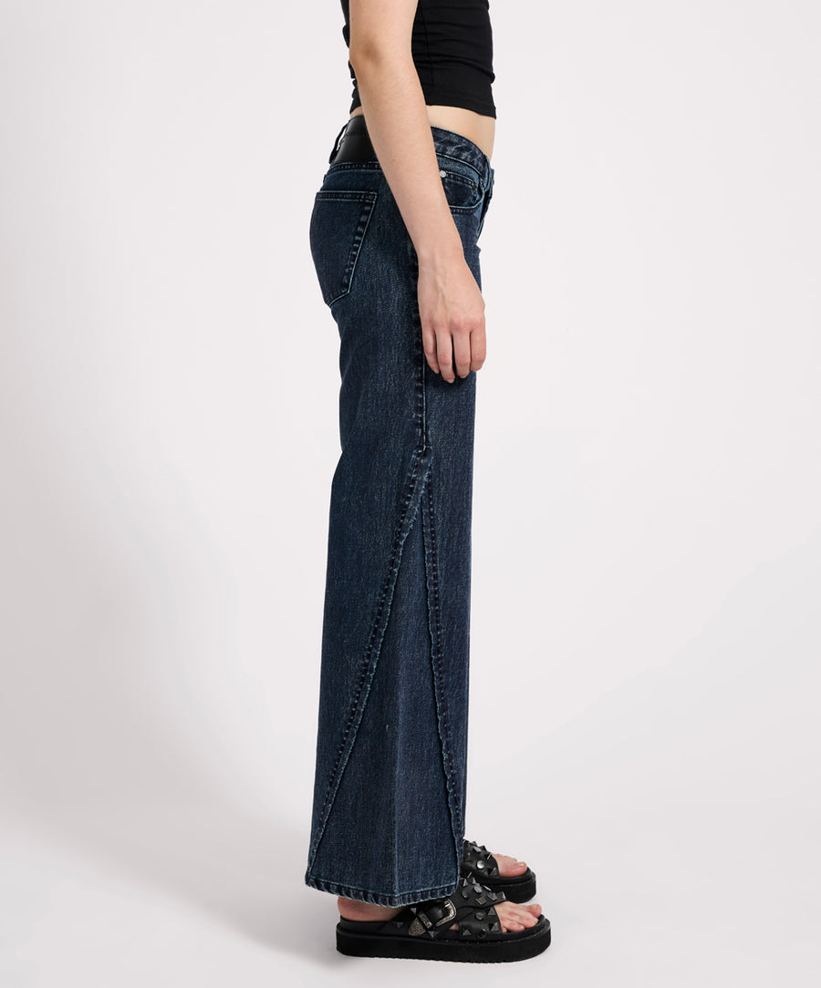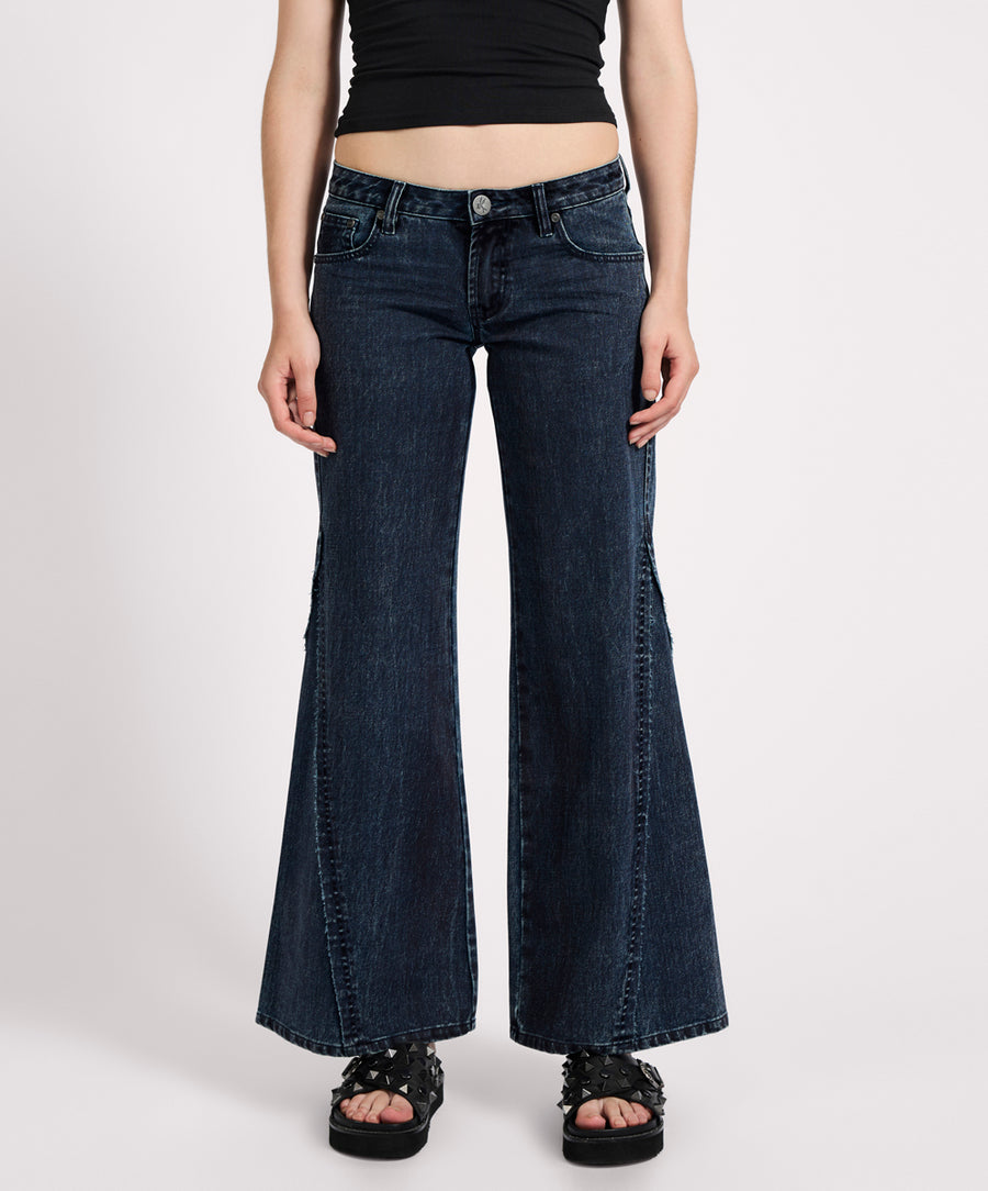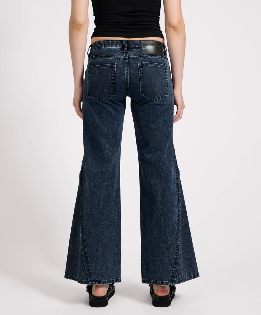 The INDIGO BLUE JOHNNIES are all about shape, flow, and throwback attitude. With a low-rise fit that sits at the widest part of your hips and a flattering flare from the thigh down, these wide leg denim jeans bring serious '70s energy. Triangle panel inserts at the hem give the flare extra drama and movement.