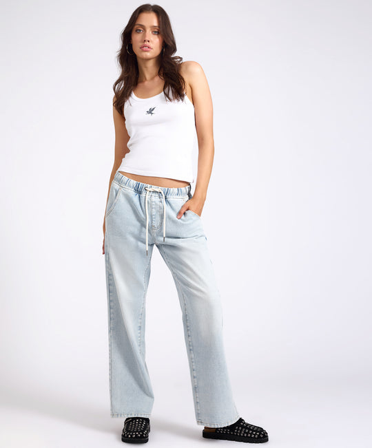 Roadhouse Mid Waist Wide Leg Drawstring Denim Jean - Blue Latte