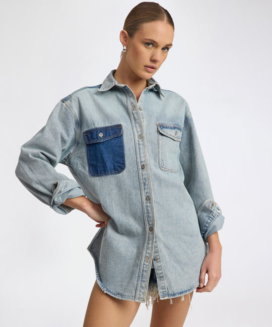 Featuring contrast dark detailing through the pocket and yoke, this shacket adds subtle edge to a clean, classic shape. Wear it open over tees and tanks or buttoned up with denim jeans for an easy double-denim moment.